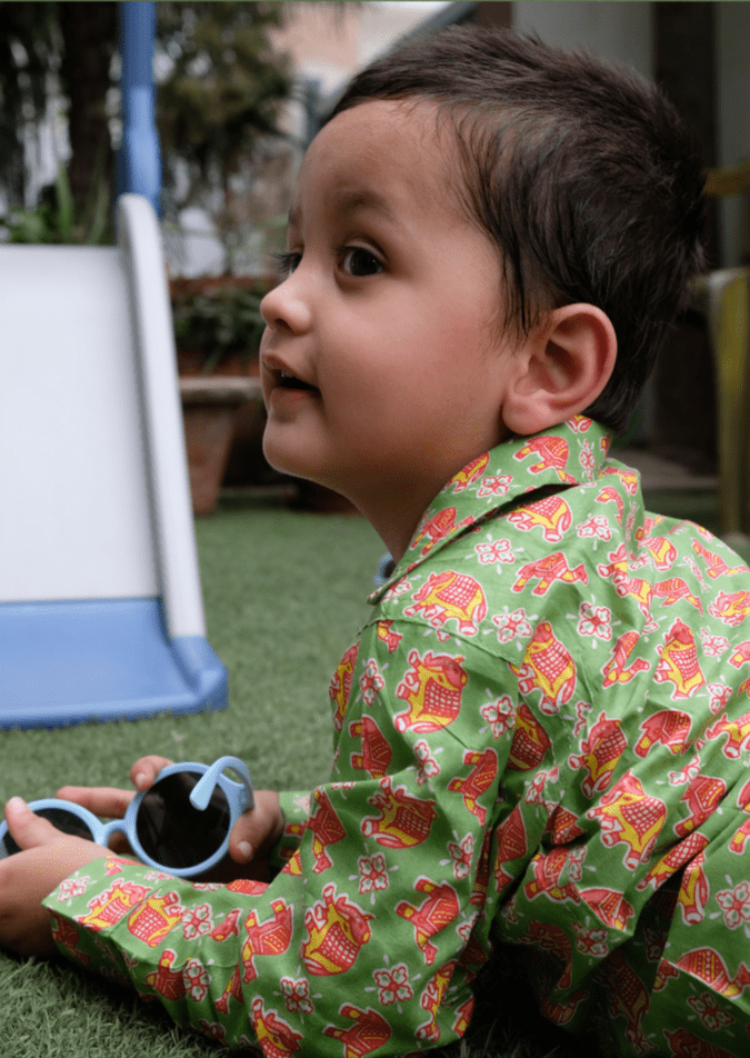 This beautiful bright green full sleeves shirt featuring colorful elephants and camels gives an ethnic...