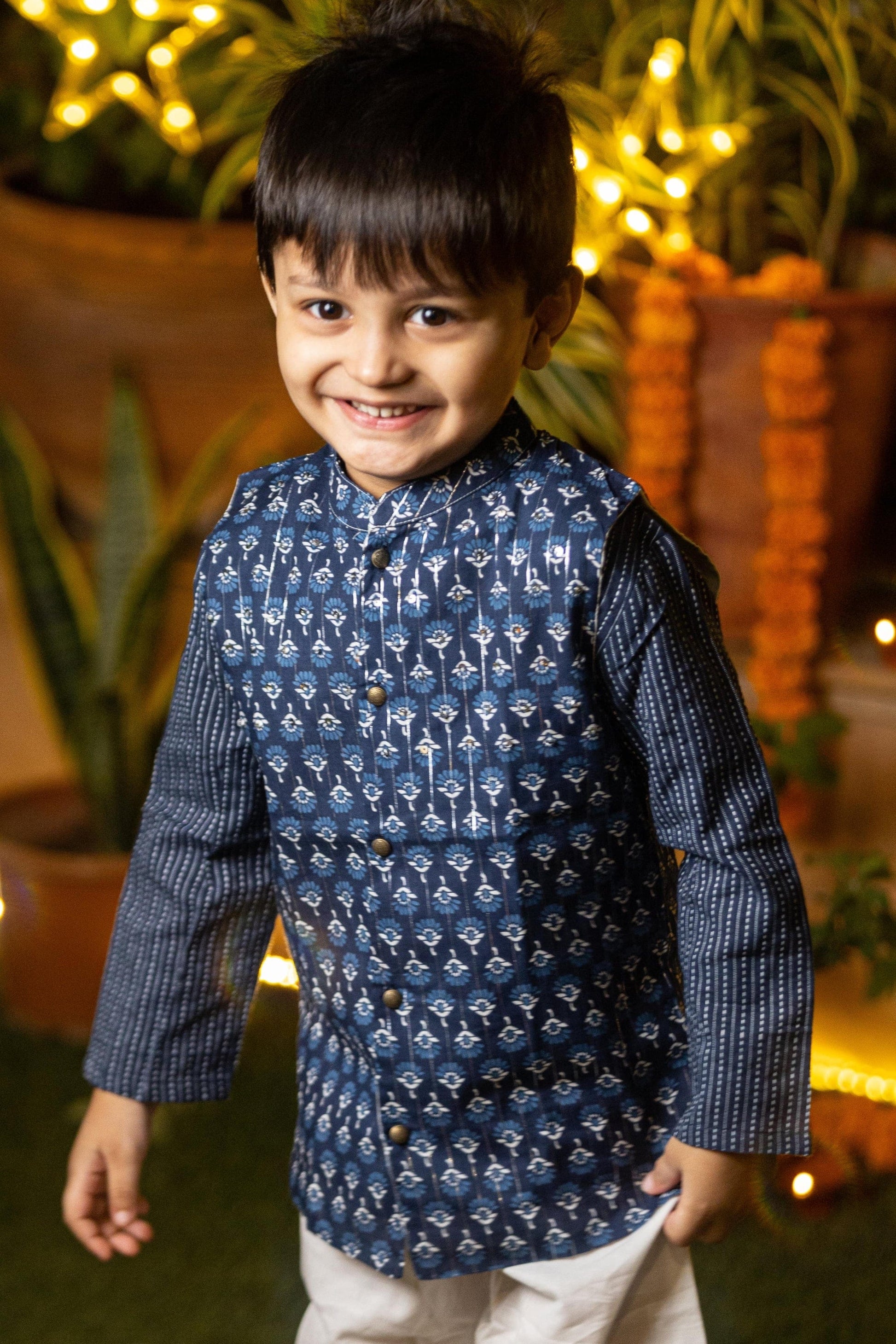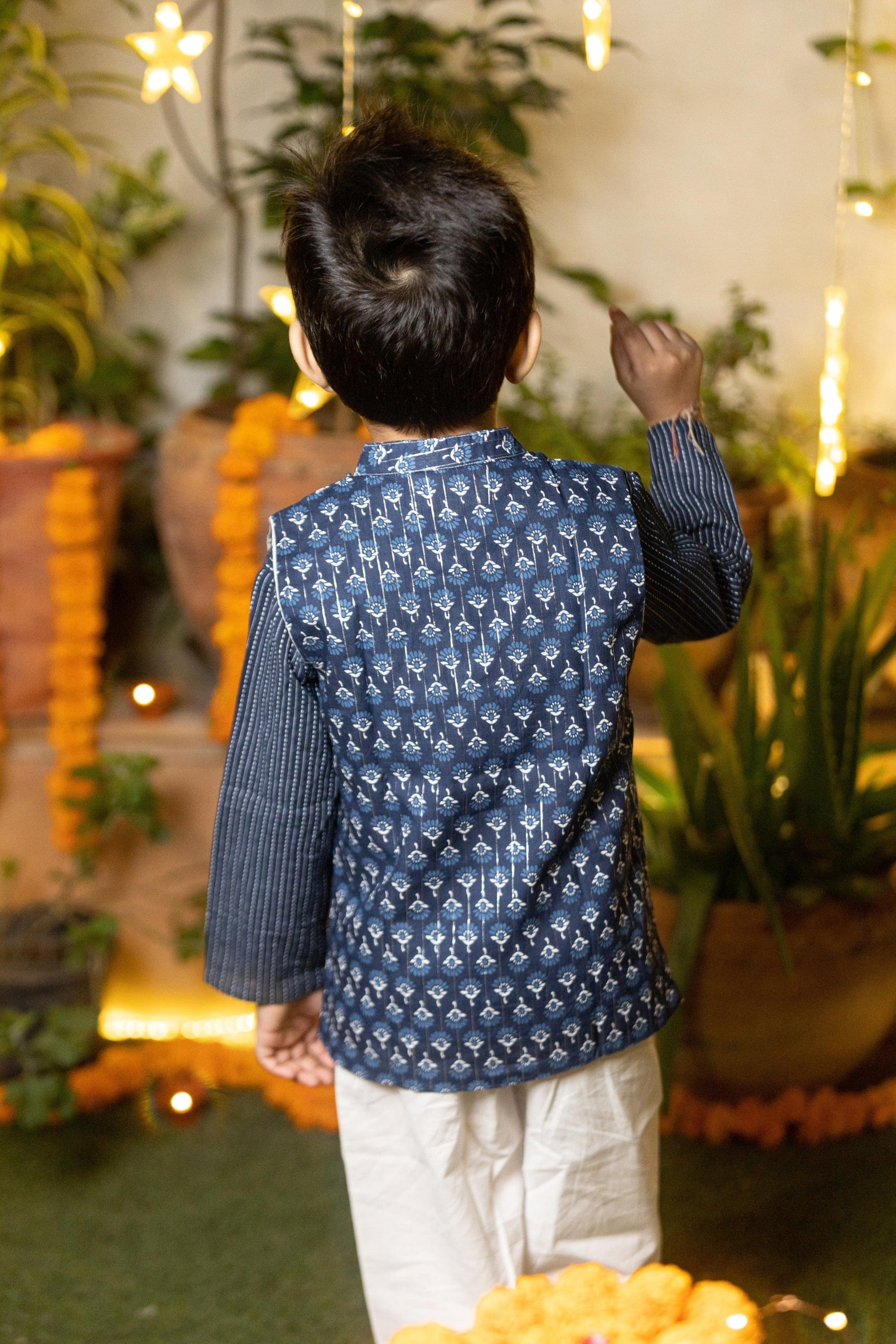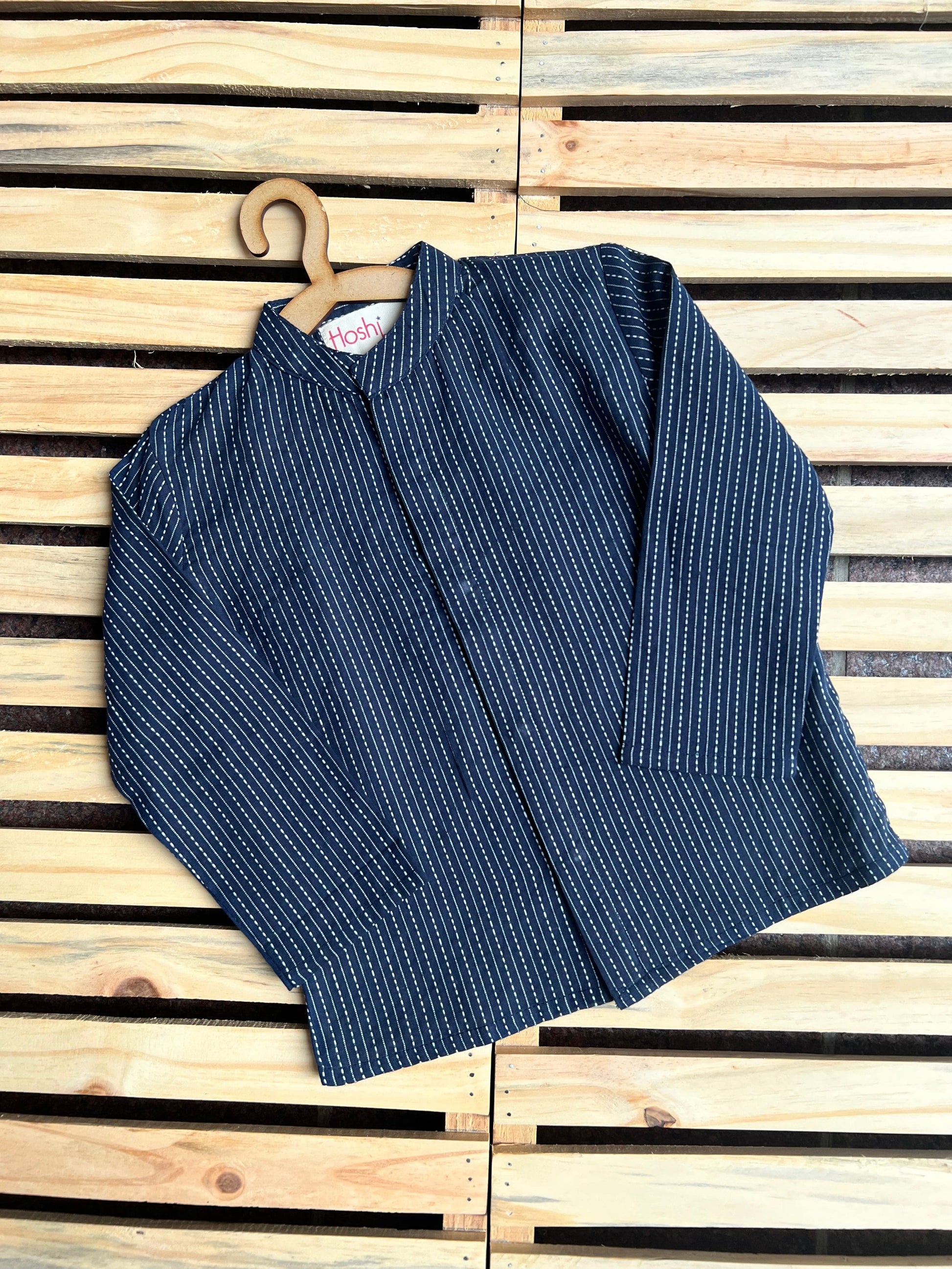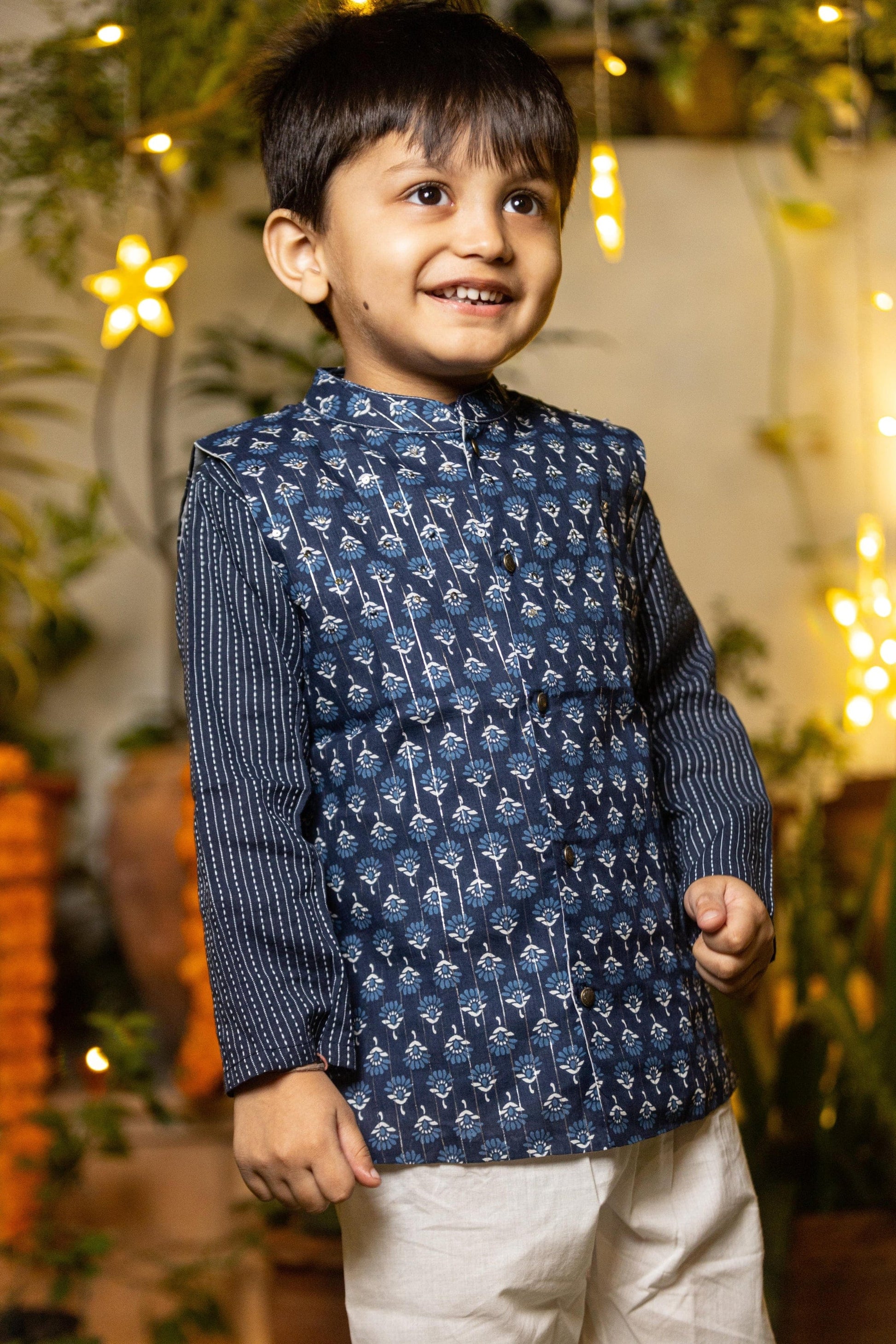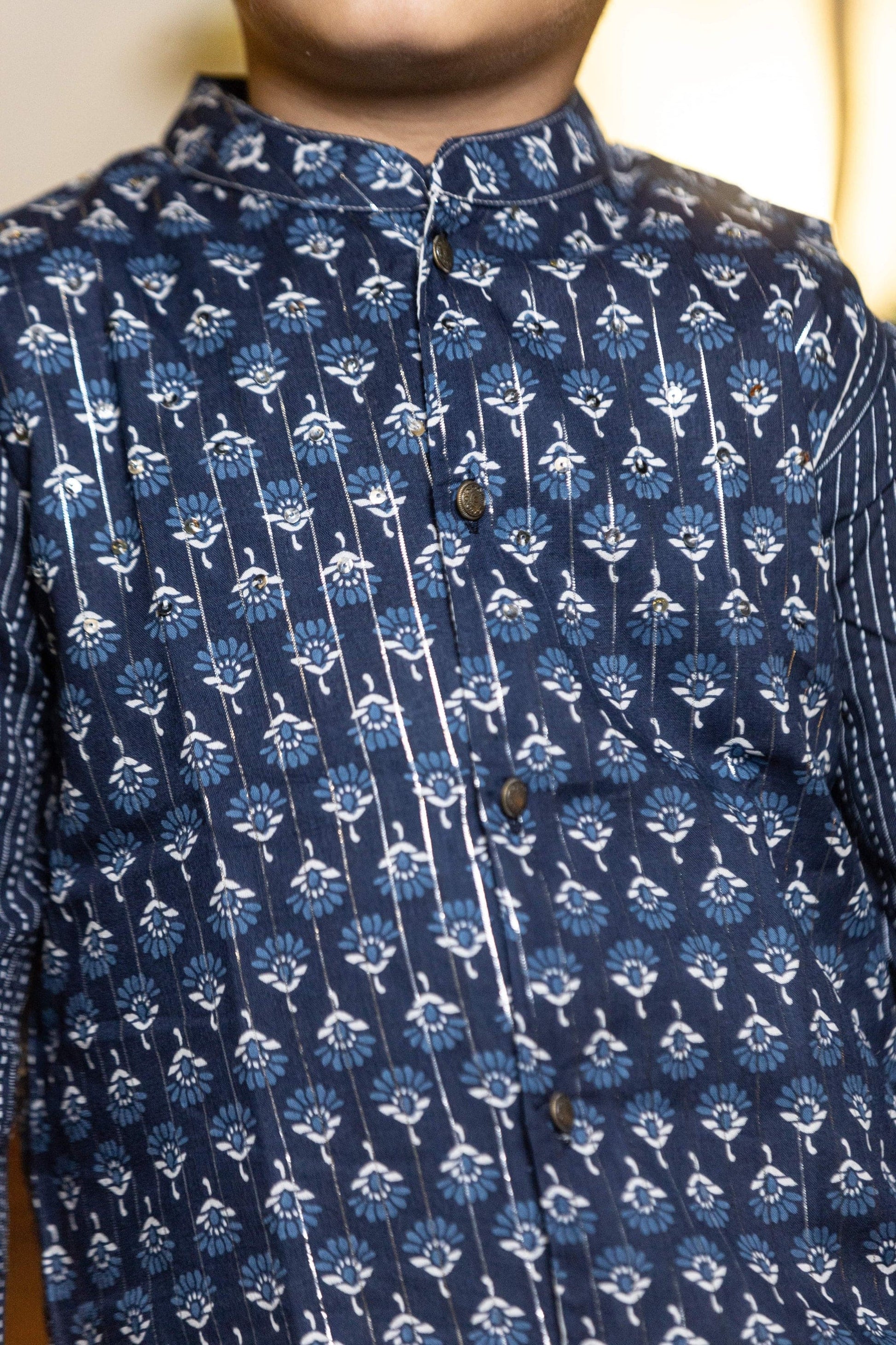 The beautiful kurta is made from 100% cotton cambric with katha embroidery, which gives it a unique look and feel. The kurta has a mandarin collar, button-down front closure and sequin work on the front of the jacket. This outfit looks perfect when paired with pants.
