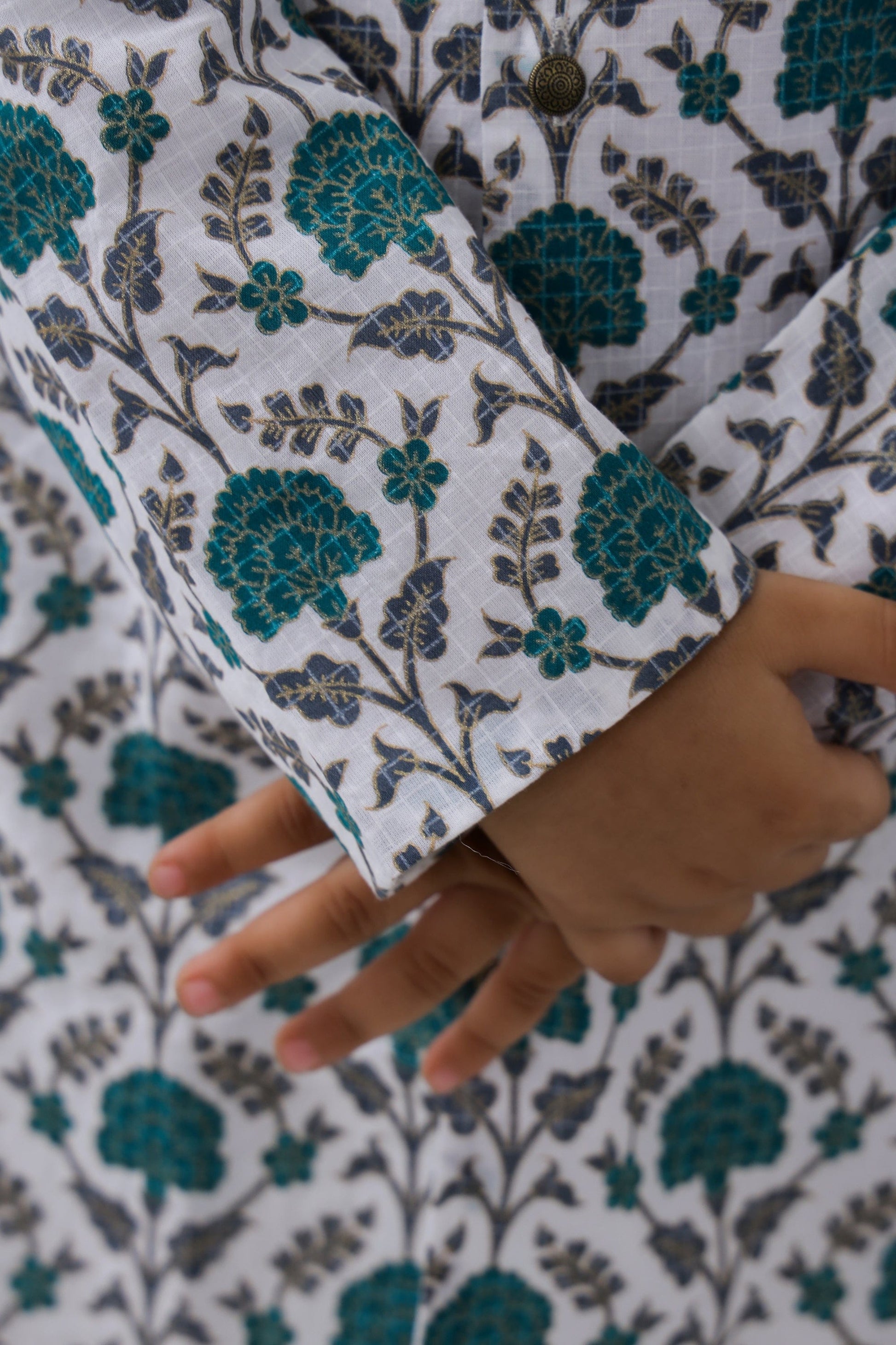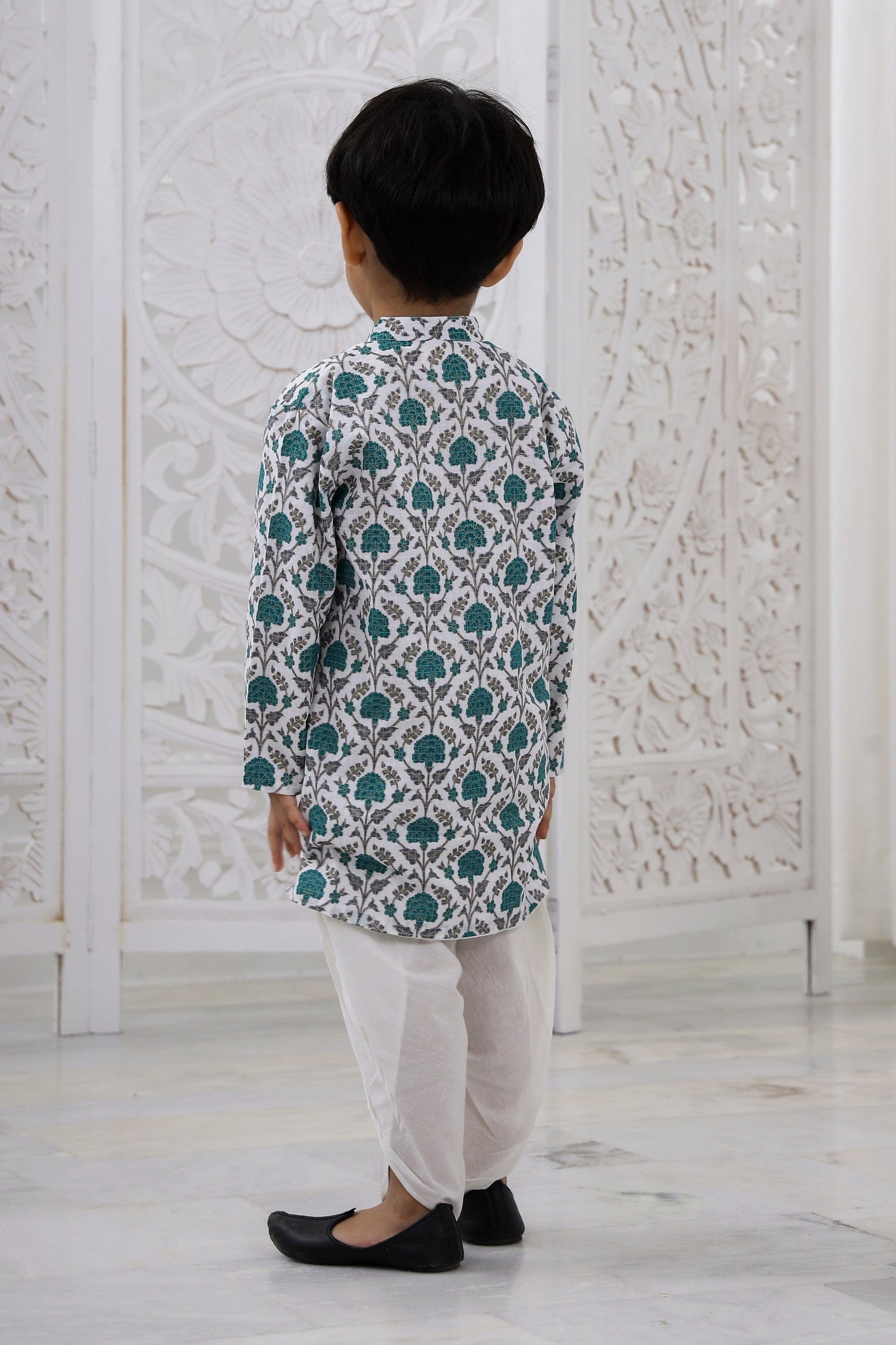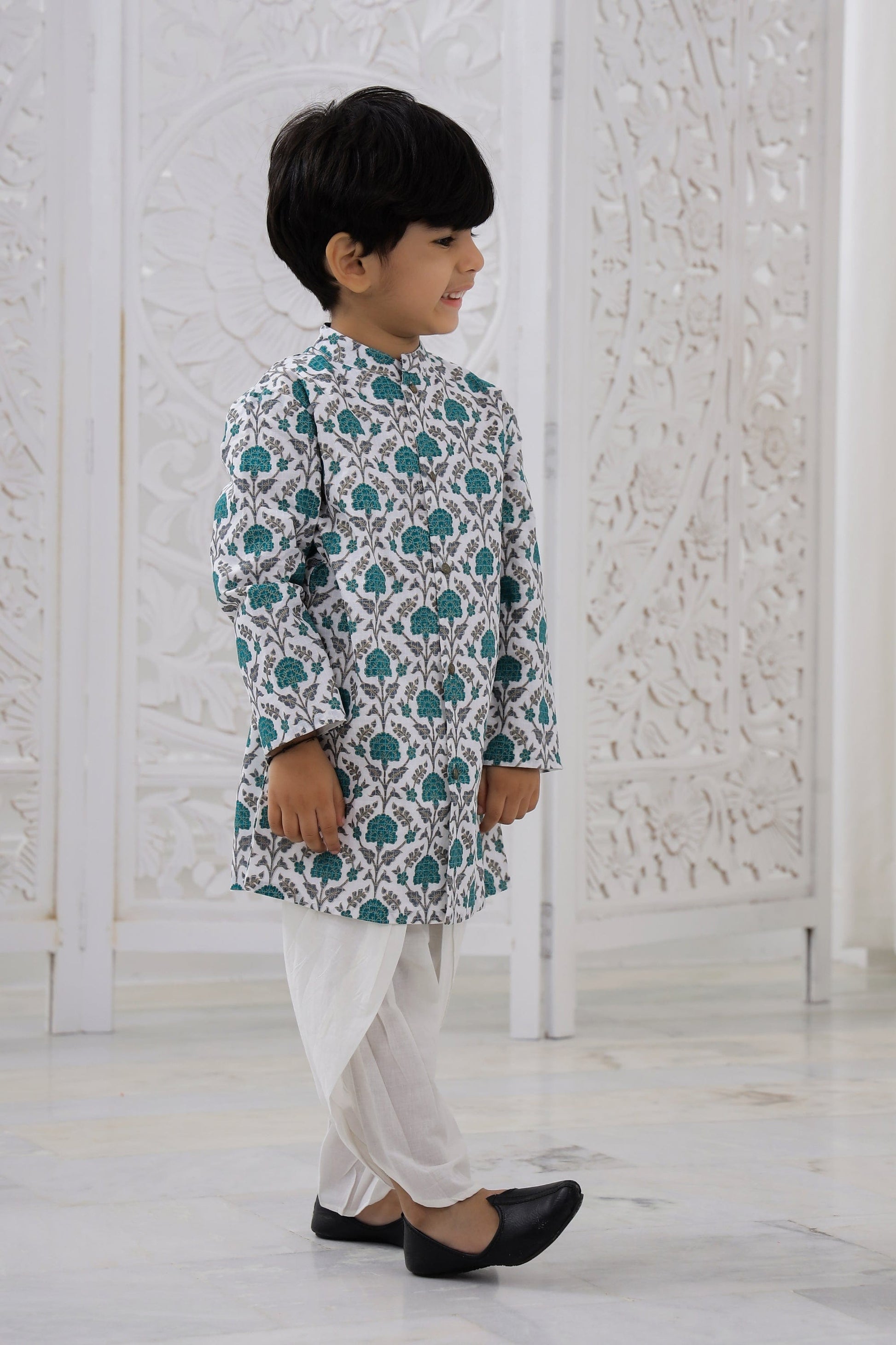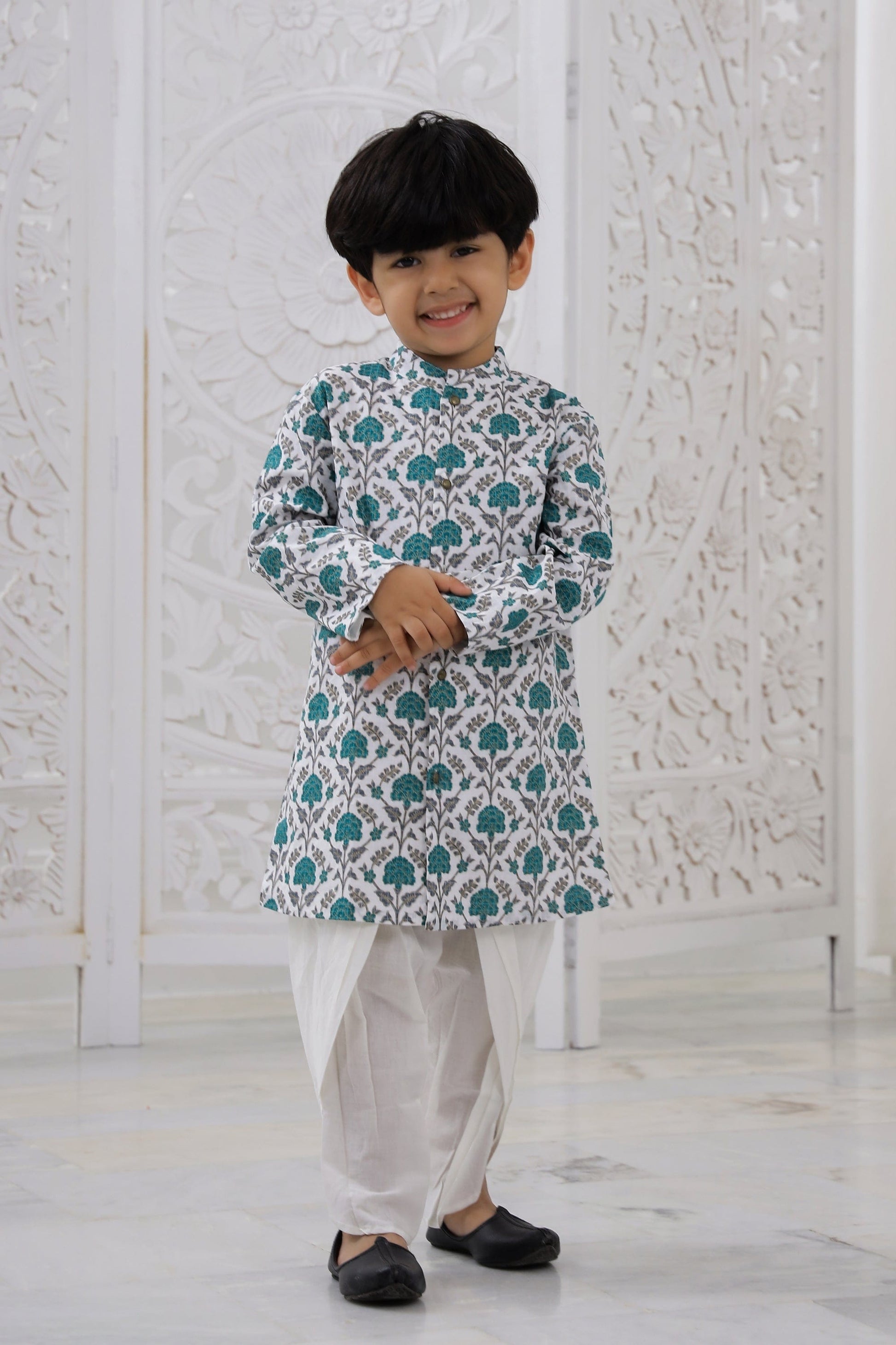 This Sherwani has a button down front, with dhotti for an excellent fit to the body. It is made of pure cotton cambric that feels soft against your skin, and has the look of traditional sherwanis but they come in more modern styles like this one.