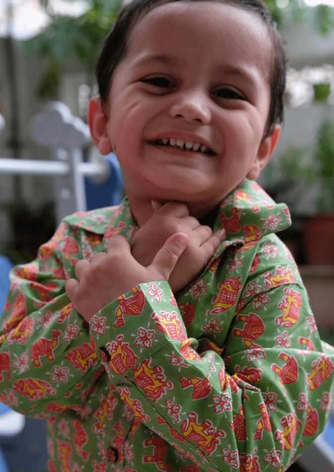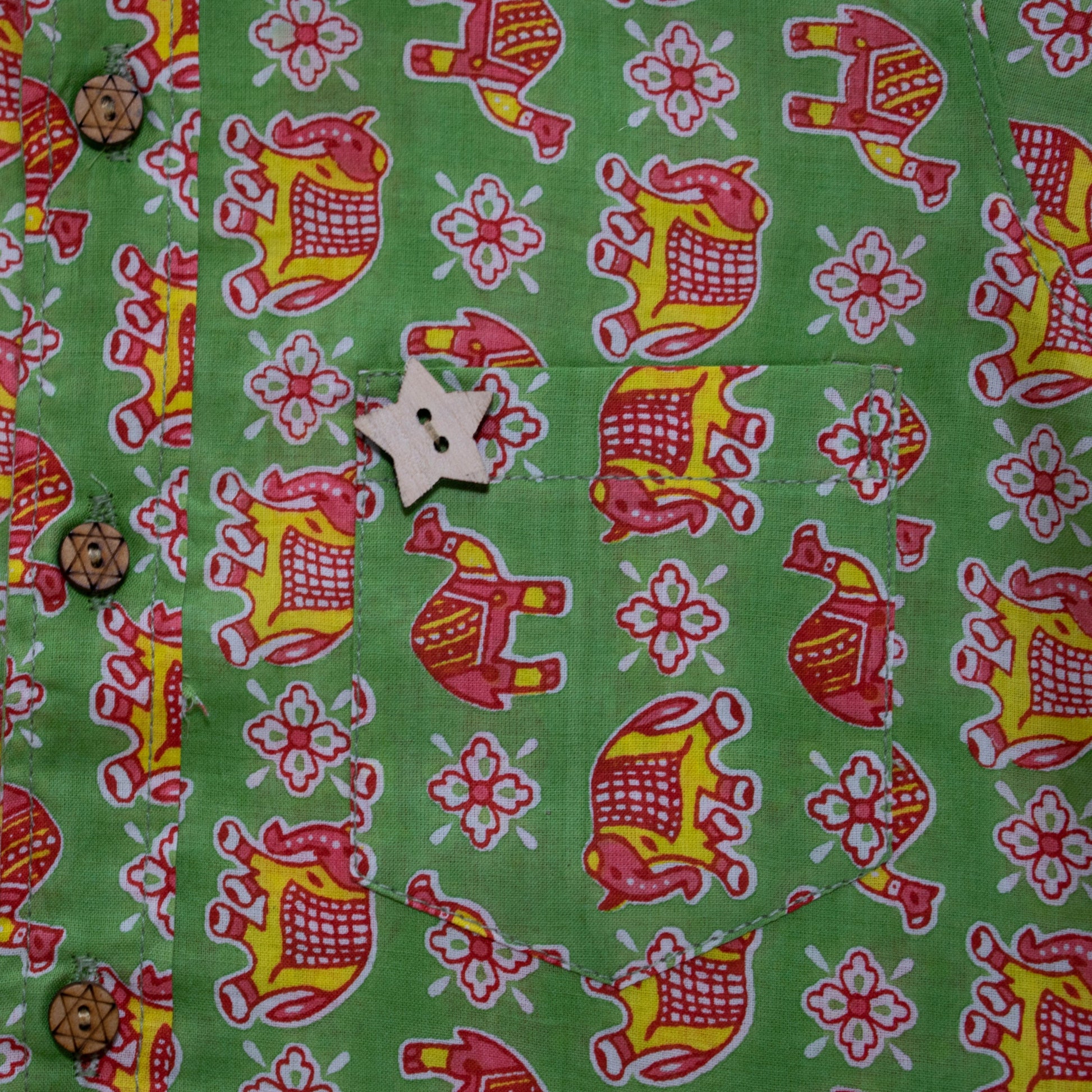 This beautiful bright green full sleeves shirt featuring colorful elephants and camels gives an ethnic yet classy look to the kids. This bright clothing is a perfect fit for parties. It can be paired with a range of bottoms, including shorts, jeans, chinos and trousers. This comfortable piece of cotton clothing offers your child a relaxed and comfortable look for summer.