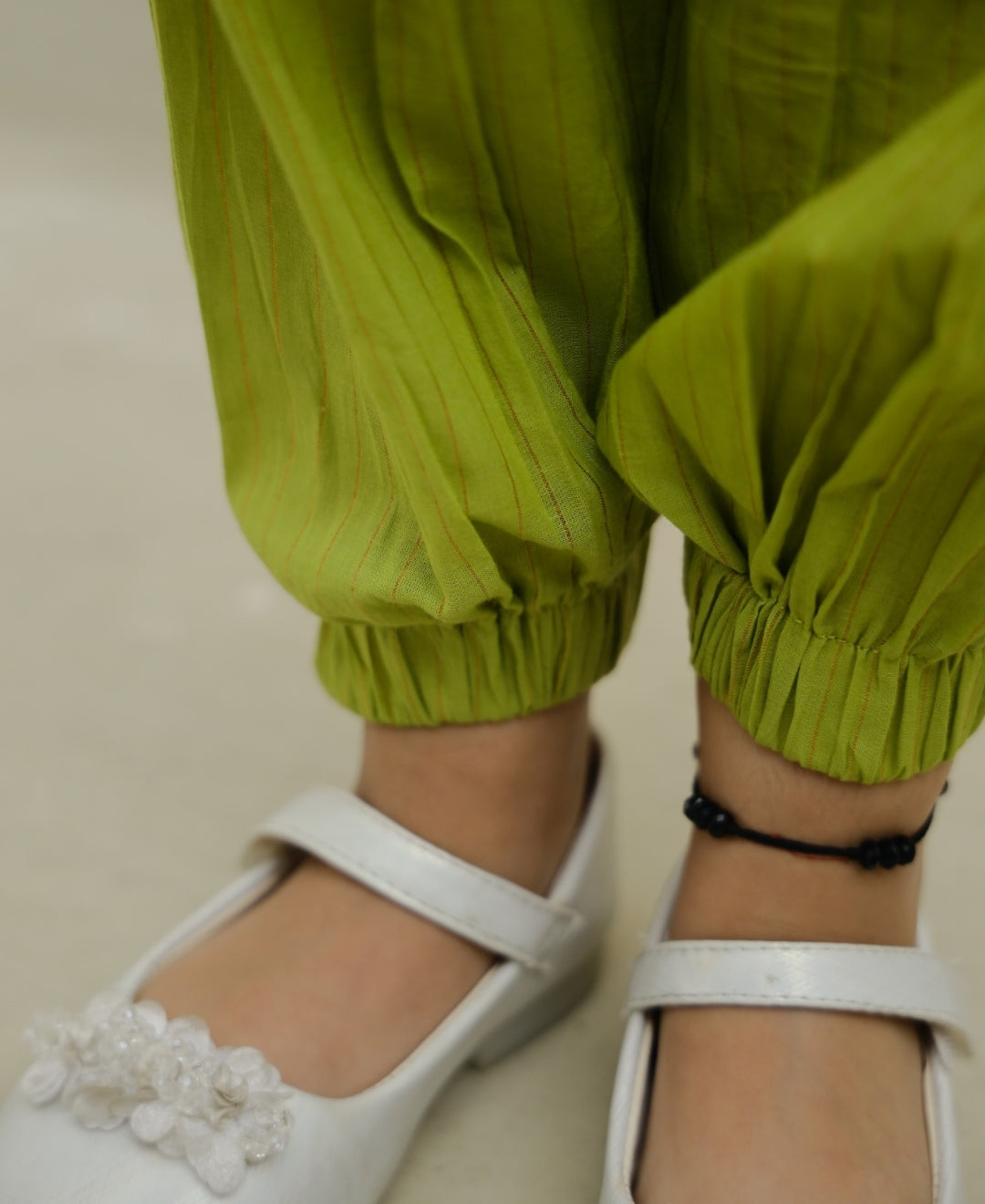 - Loose green kurta with a convenient hook opening in the front
