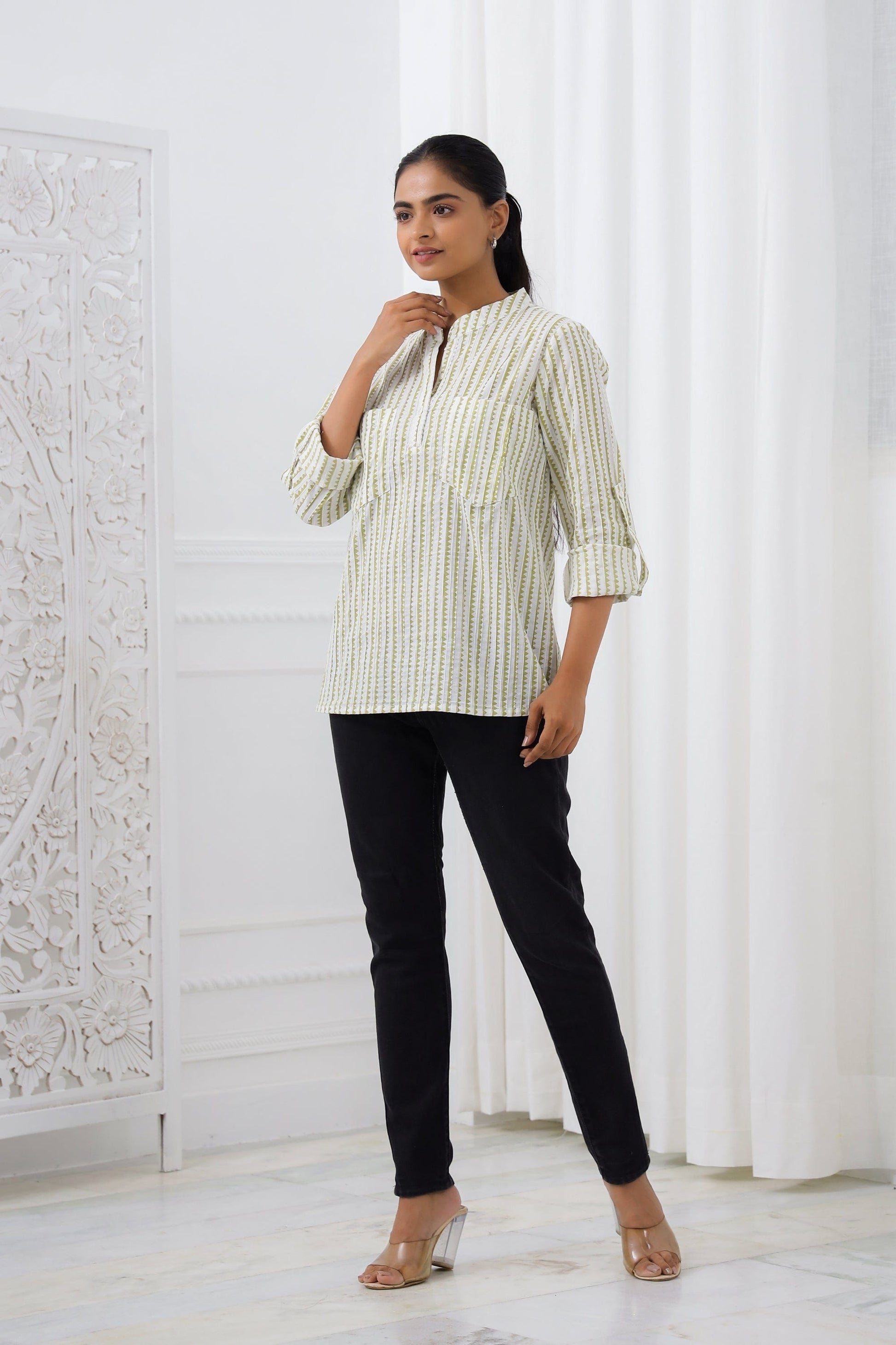 - 100% Pure cotton cambric with pintucks - Light green color - Chit buttons closure on the pockets in the front, allowing easy and discreet breastfeeding -Soft and breathable printed fabric - Topper