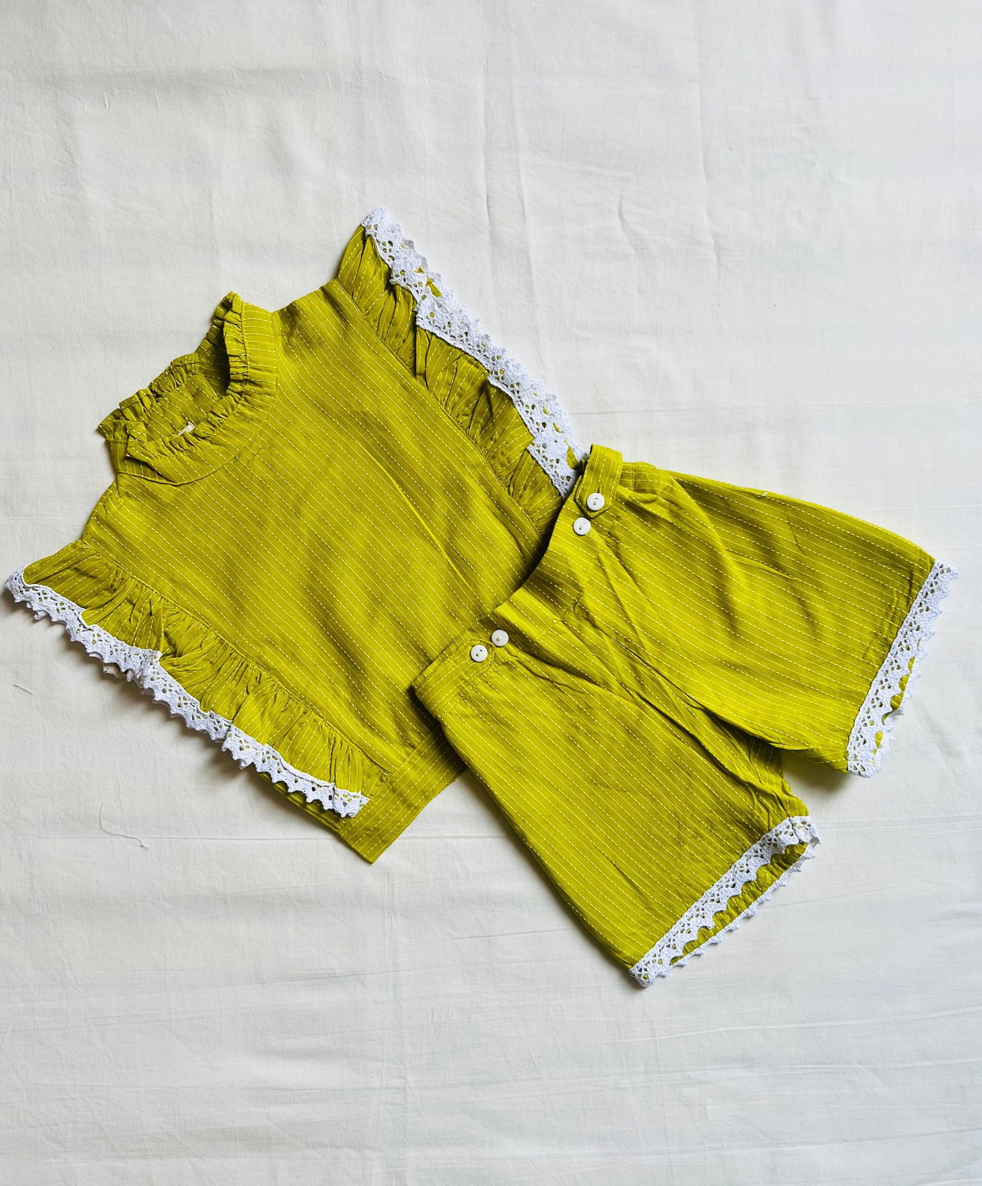 This co-ord set is perfect for the warm summer days. The blouse sleeves are laced, and there are buttons at the back of the blouse to make it easy to wear. Put on these shorts which have an elastic waistline, and you're good to go for a day in the sun. This fashionable design is perfect for your next getaway!