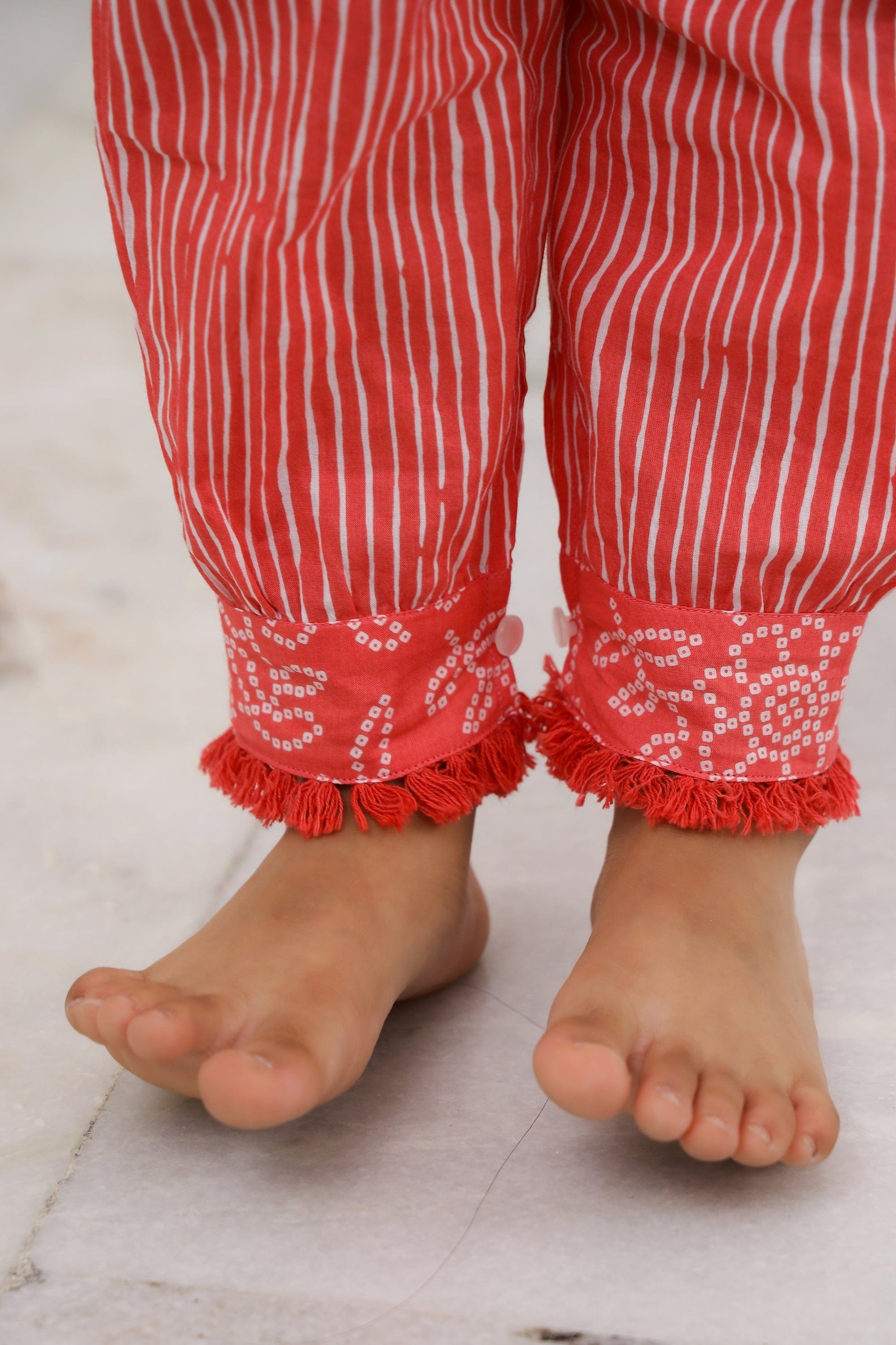 This Kurti salwar is a perfect combination of style and comfort. The kurti is made of pure cotton cambric and has a kurti with Afghani Pants that has velzera tassel cotton lace on kurti sleeves, kurti hem & on pants bottom hem. Also comes with 3/4 sleeves with loop buttons at cuff, yoke with pearl lace & mirror lace, and an elasticated pant with a button at hem bottom.