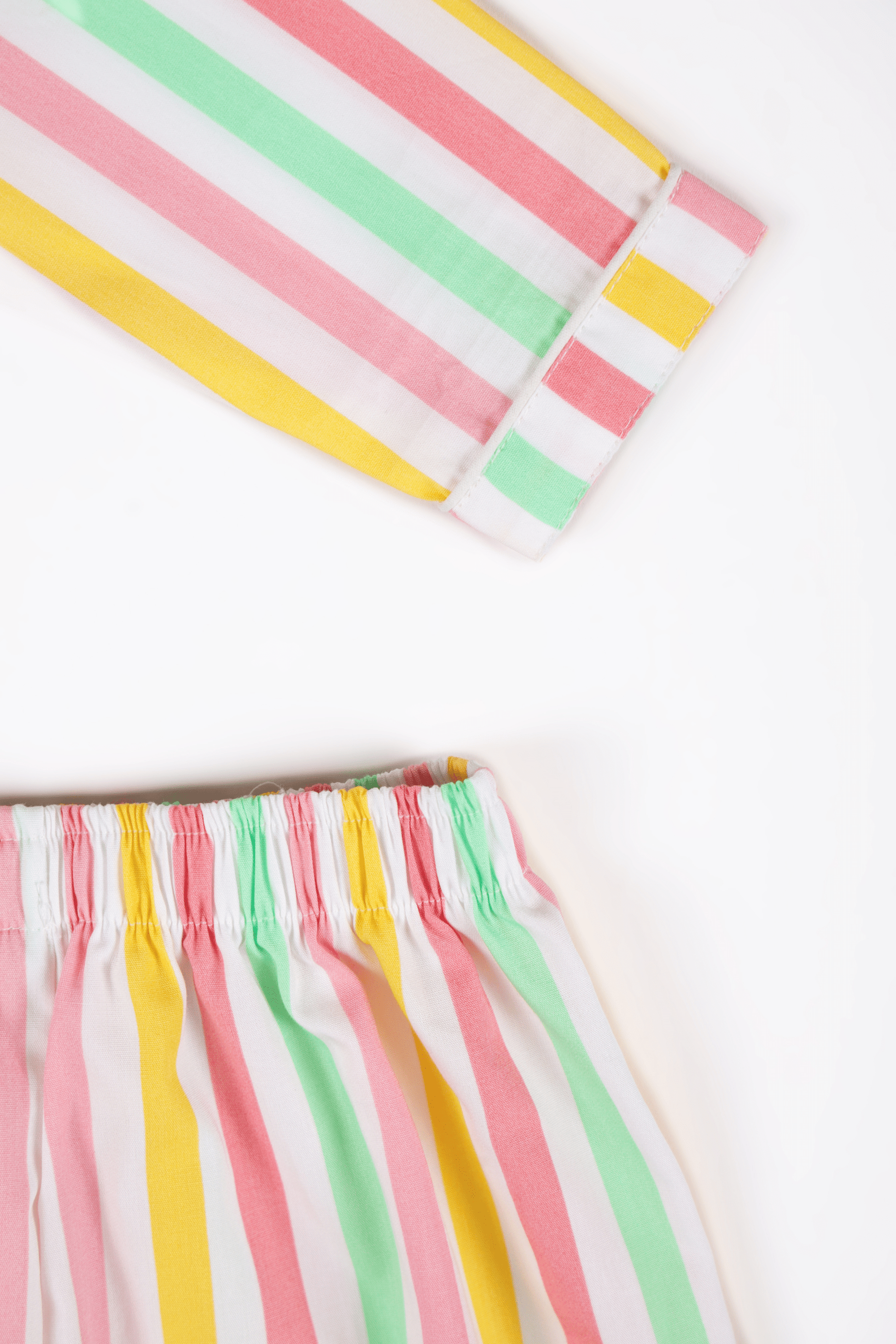 This exquisite 100% cotton set features a notch collar full-sleeved top and pants with delicate pastel stripes for a modern take on a classic look. Each piece is adorned with beautiful piping all around for an eye-catching design. Plus, the pants have an elastic waist for added comfort and ease of wear.