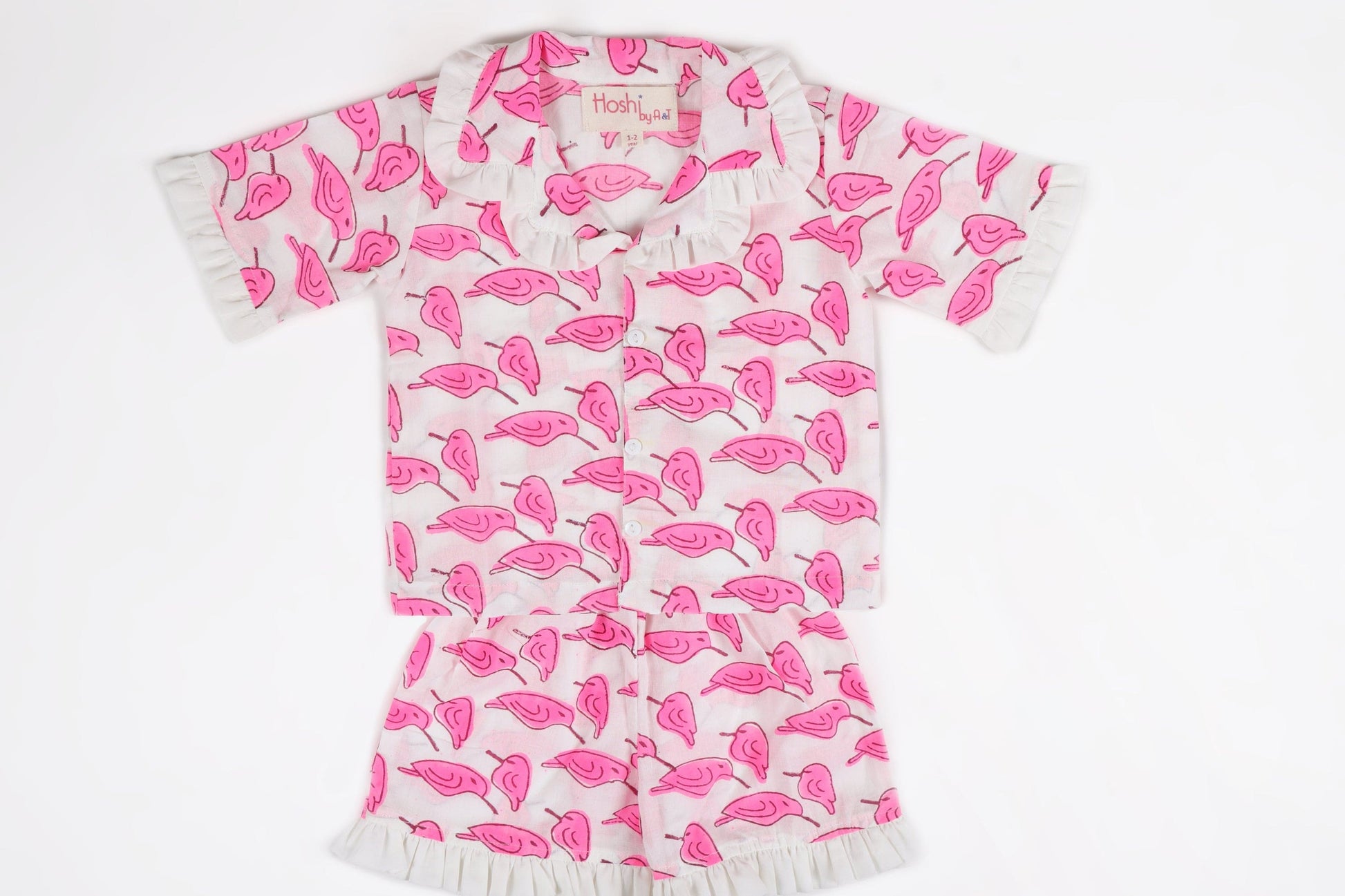 This beautiful and comfortable 100% cotton set features a notch collar and half-sleeved shirt with shorts. The frills on both the top and the shorts add an element of femininity, while the elastic waistband provides extra comfort when wearing. With an adorable pink bird print pattern, this set will make any day brighter!