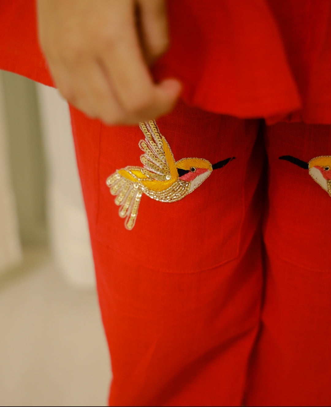 - Sparrow embroidery on the pants adds a fun, playful touch