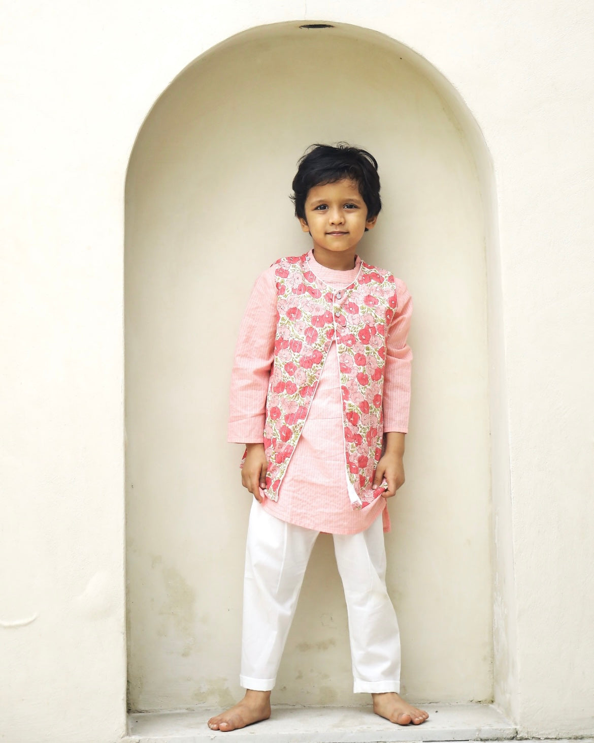 The asymmetric long kurta has tich buttons on both the shoulders. It is made of 100% pure cotton cambric, which is light weight, soft and comfortable. The jacket has two buttons in front & sequin work too. The pants with elasticated waist will add elegance to your look