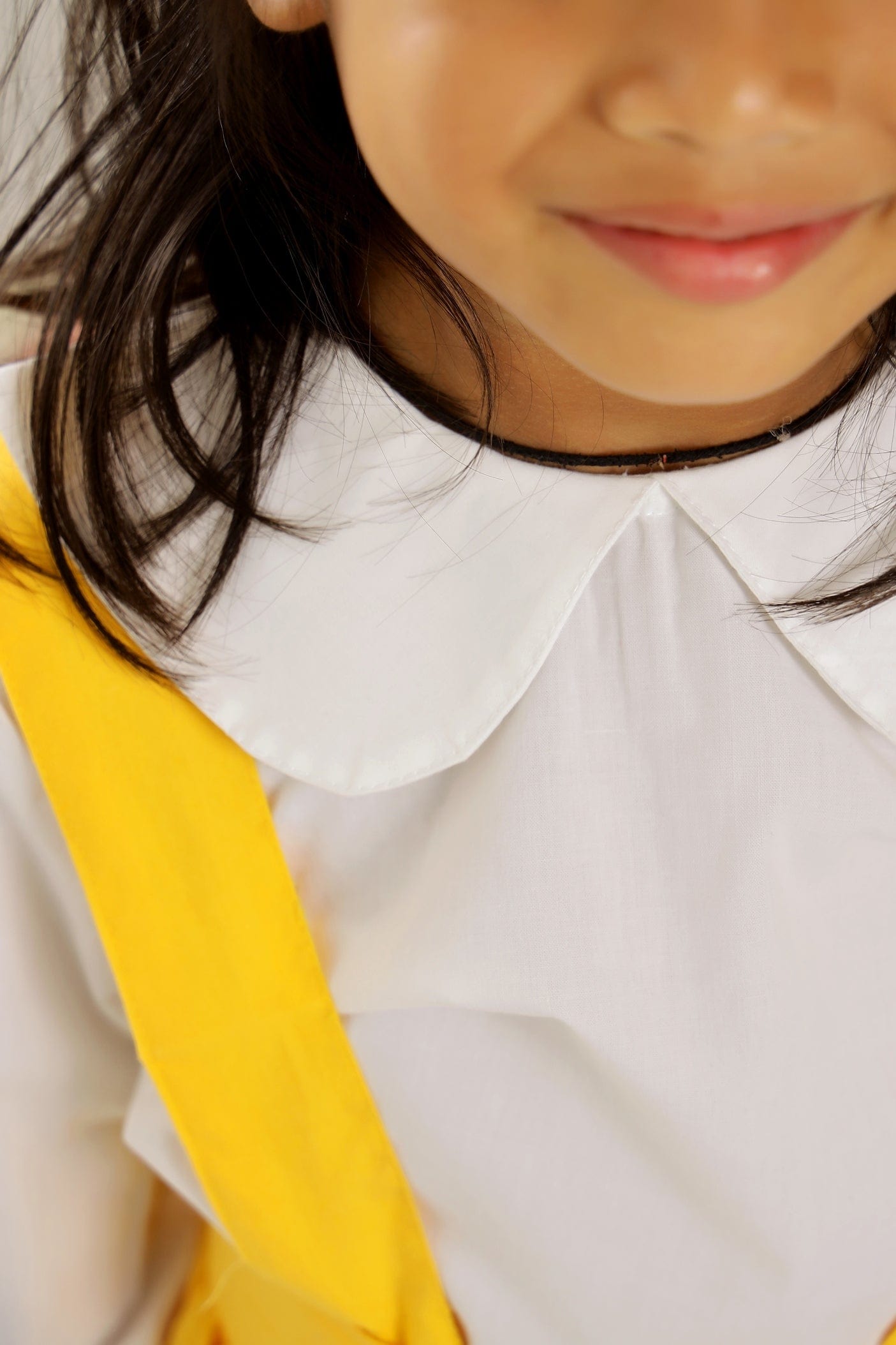 It's time to take your little princess out of the castle and onto the streets. Let her wear this Sunshine Daisy cotton printed poplin skirt dungaree & peterpan collar top. Make her stand above the crowd. Playful comfy wear all day long for the Lil Star.