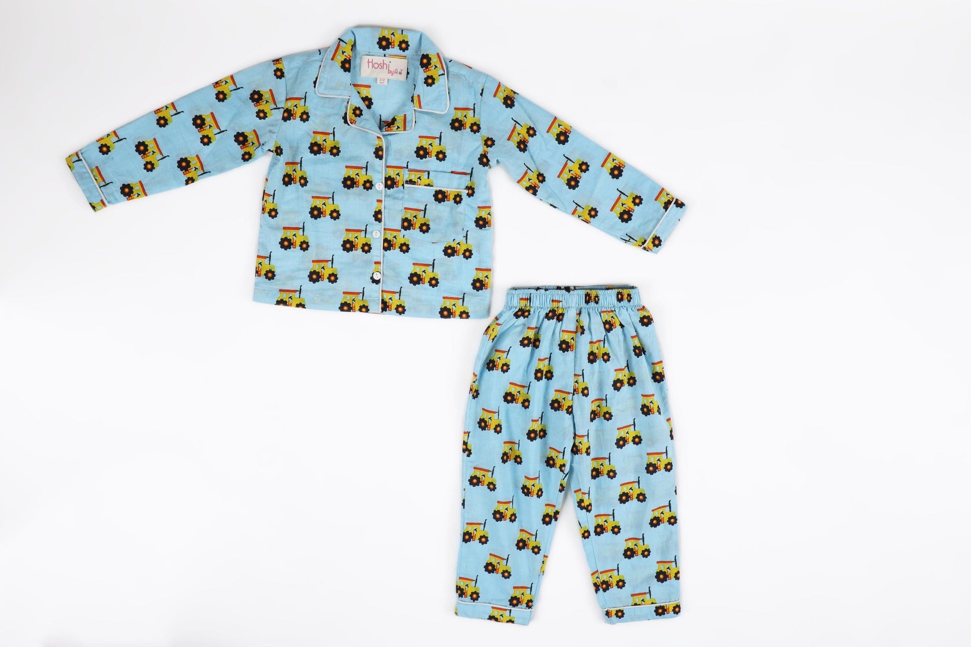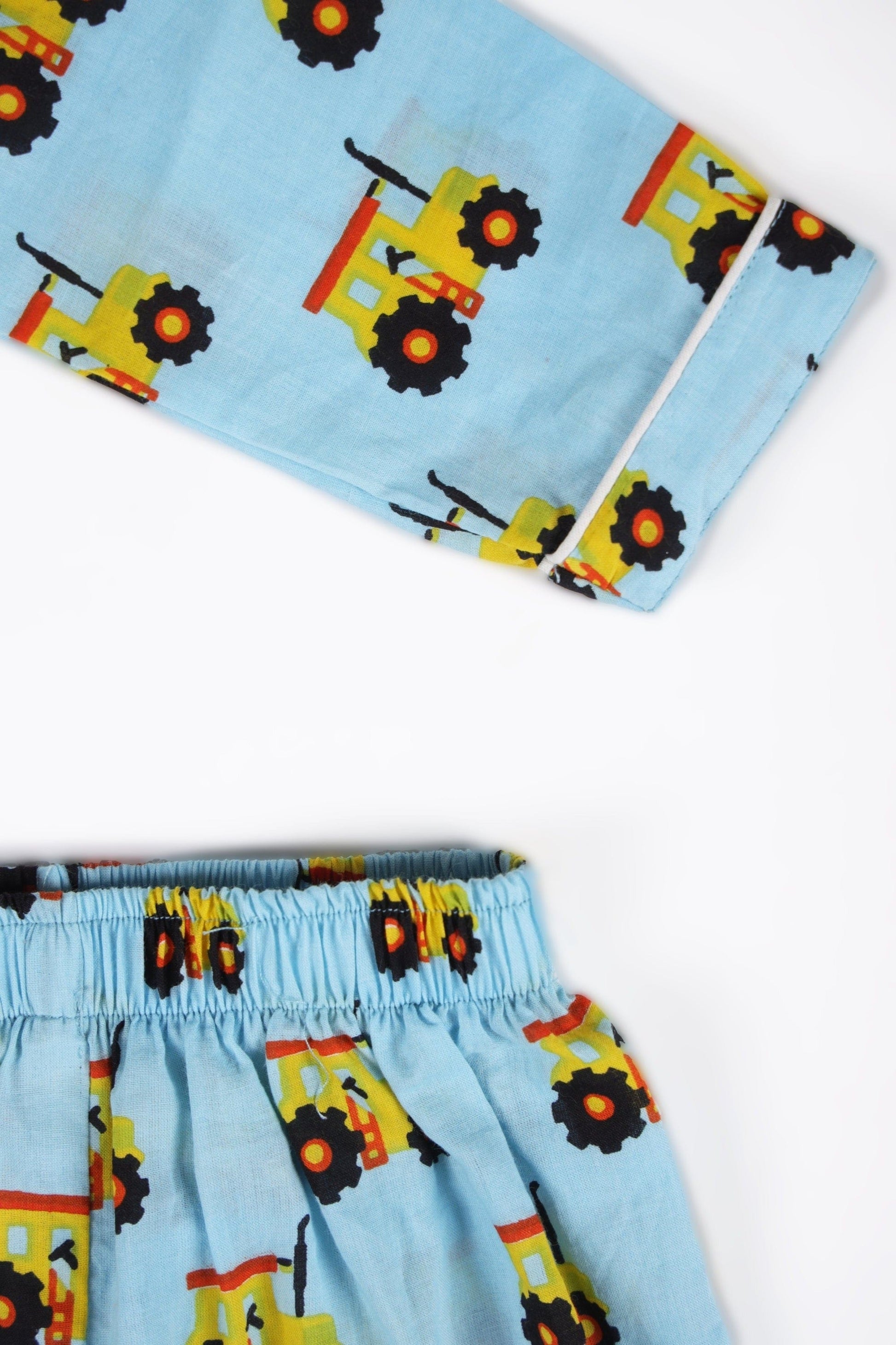 Nothing beats cozying up for a good night's sleep with a comfortable cotton nightsuit! This soft and cuddly 100% cotton nightsuit features a classic notch collar with elasticated waist pants and trendy piping all over for a classic look. Button down front opening top completes the look, and it is topped off with a charming tractor print for added fun. Slip into this nightsuit for a blissful and restful night!