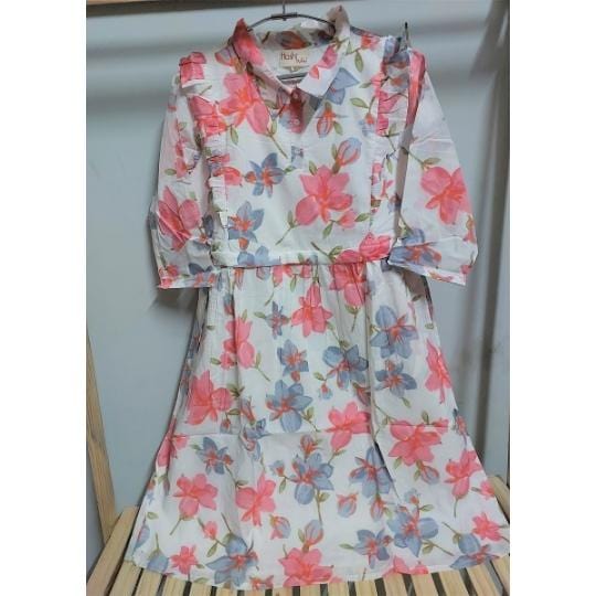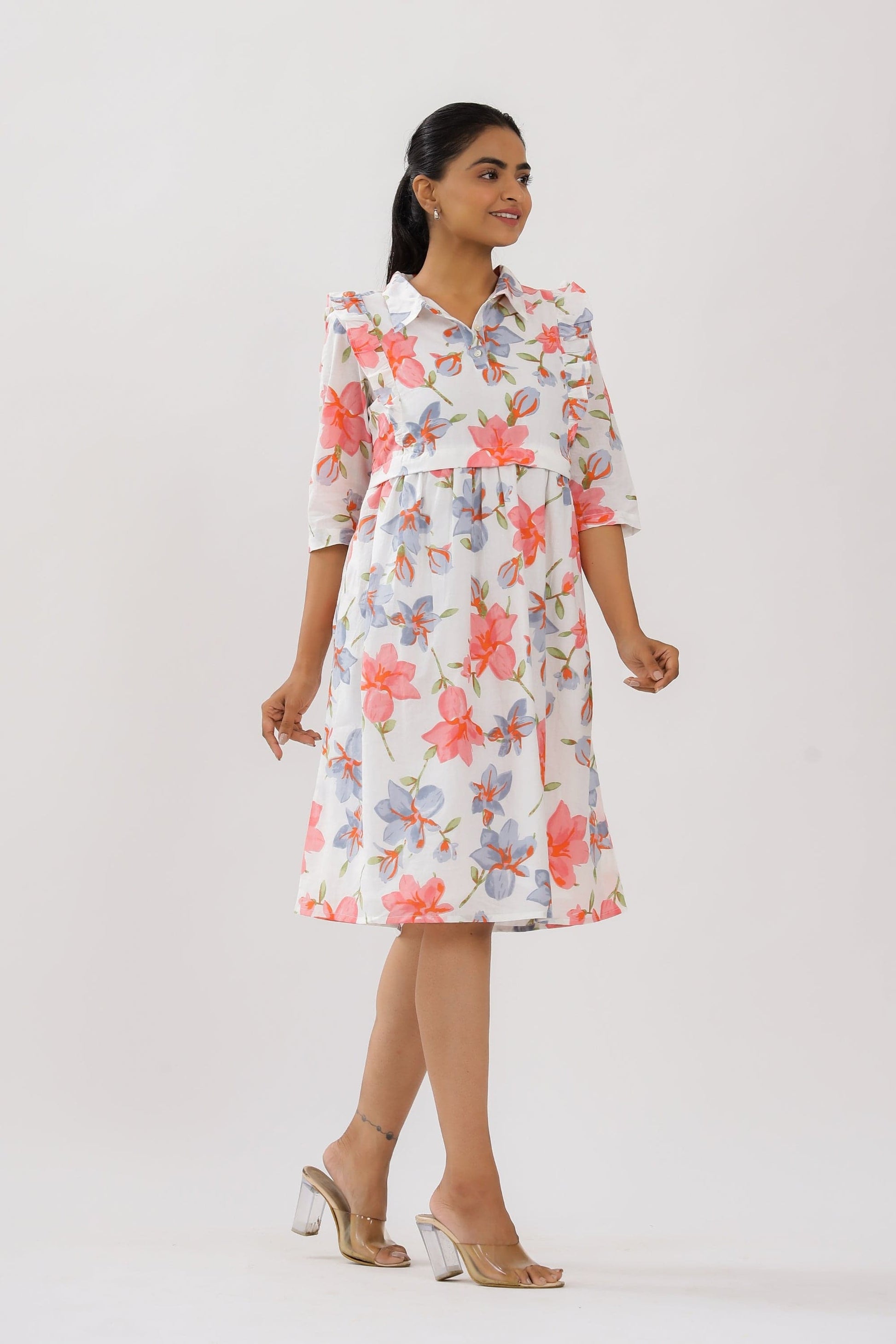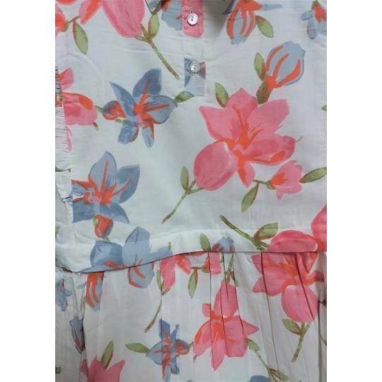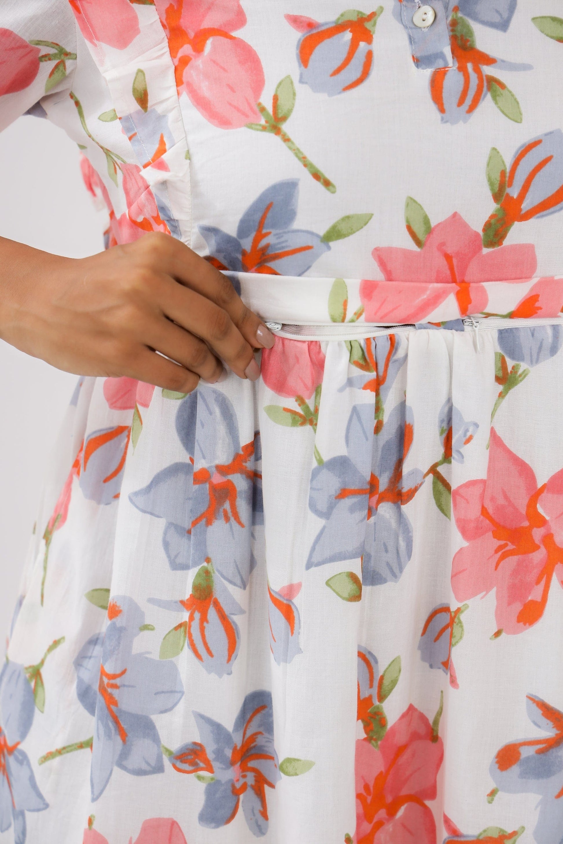 - 100% Pure cotton cambric - White color - Zipper placement in the front with flaps, allowing easy and discreet breastfeeding -Soft and breathable printed fabric - Midi Dress